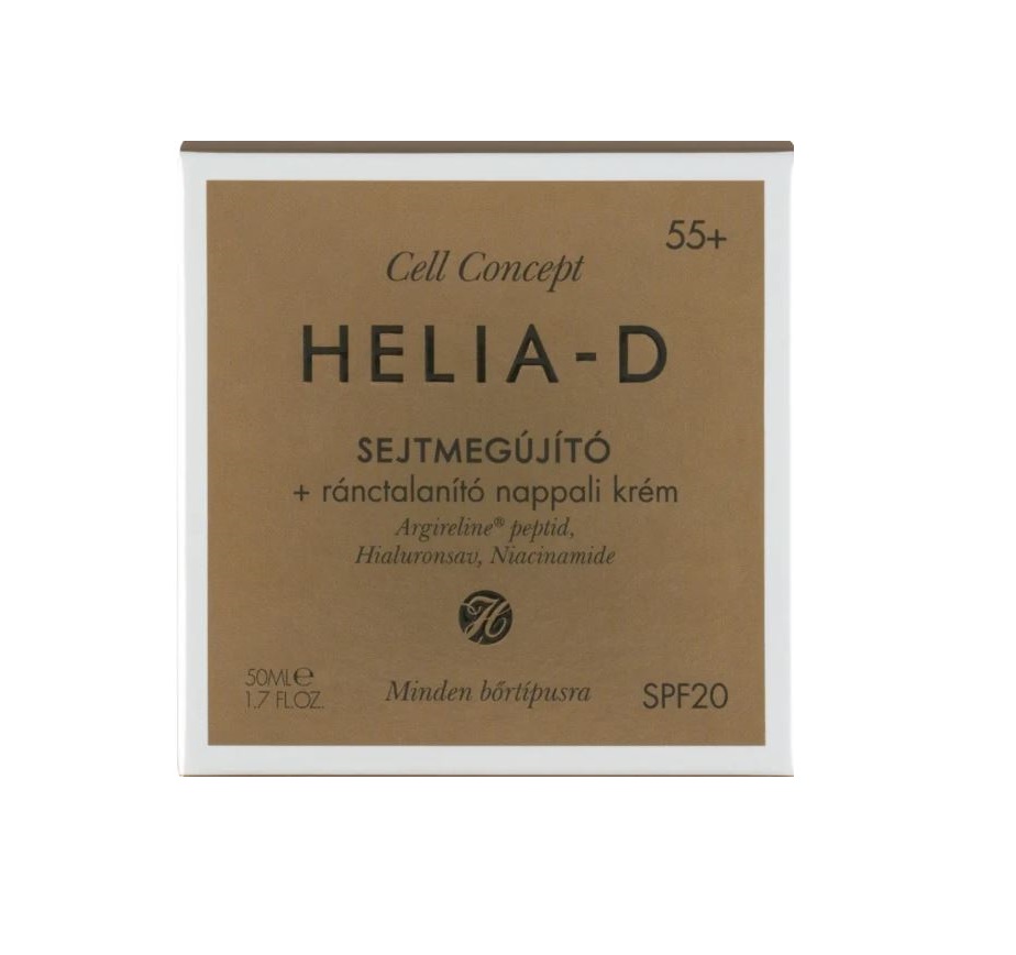 Helia-d Cell Concept sejtmegújító-ránctalanító nappali krém érett bőrre (55+), UV védelemmel ellátva, argán őssejt kivonattal, retinol, lipograd hozzájárul a ráncok csökkenéséhez, argánolaj seavaj, körömvirágolaj és szőlőmagolaj a bőr puhításhoz nyújt segítséget a bőrnek.